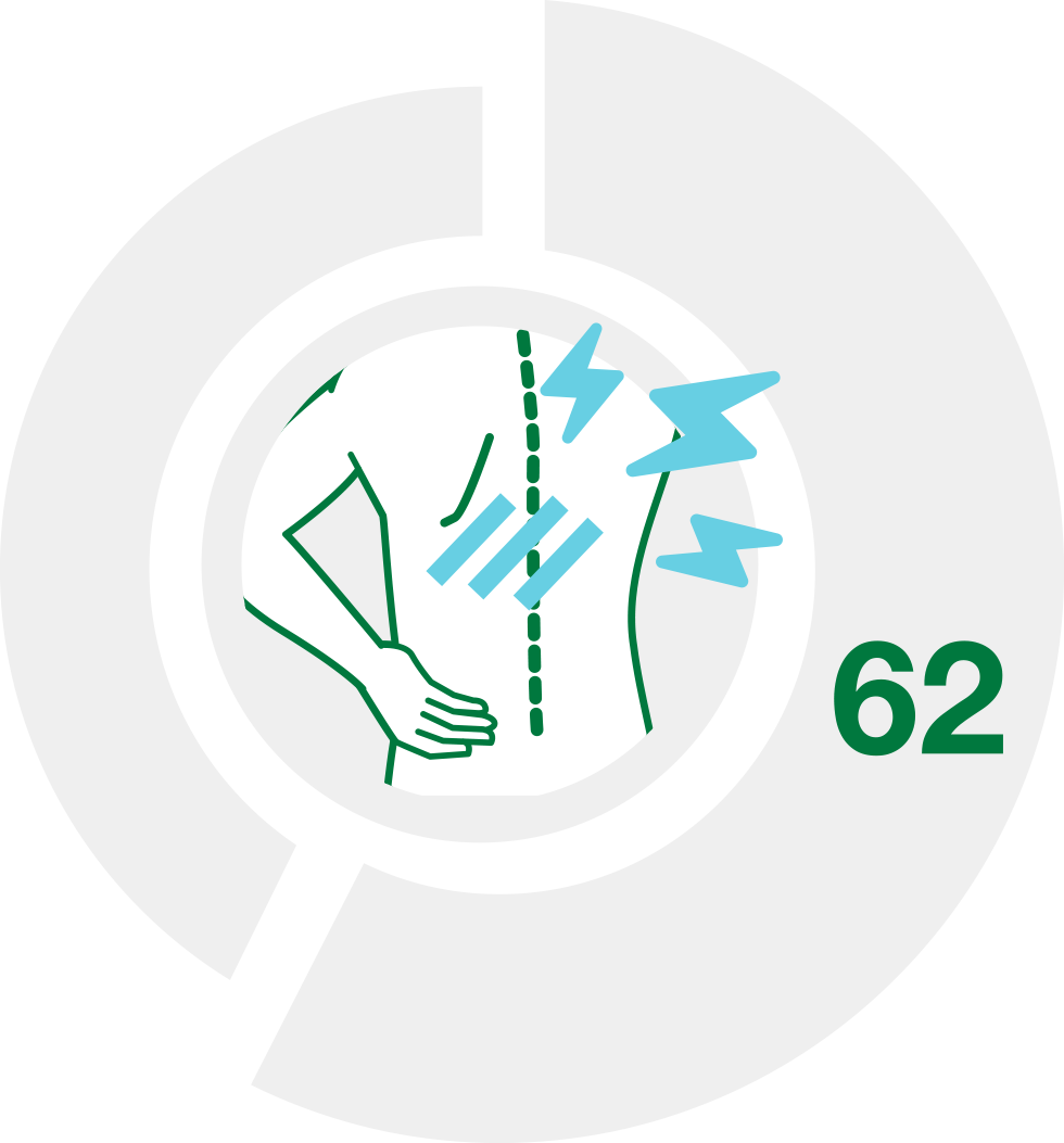 In a recent study, the most common complaint was back pain, with 62% of the sample affected.*